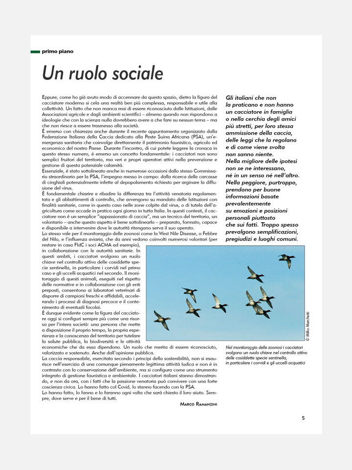 PRIMO PIANO; ATTUALITÀ, Riflettori accesi sulla PSA; DALLE AZIENDE, Nel segno della passione per il “re della macchia”; GESTIONE, Per una buona gestione degli ATC; CINOFILIA, Selezioni Campionati del mondo: un lavoro durato un anno; CULTURA, A caccia con la famiglia de’ Medici; CULTURA, Eugenio Cecconi: la Maremma tra caccia e dignità delle donne